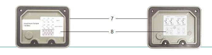 頂蓋是由耐氣候變化的鑄鋁合金制成,表層已涂色. 頂蓋部件上部有一個接線盒(圖4中1),在接線盒前面有一個放氣閥(圖4中2)和一個用悶蓋螺母(圖4中3)覆蓋的測試按鈕,同時上面還附有一個測試按鈕操作說明標(biāo)牌(圖4中4). 接線盒中除了有一個接地點(diǎn)(圖4中5)外,頂蓋底板內(nèi)還裝有電力引線端子(圖4中6). 通過電力引線端子的數(shù)量可以決定涉及干簧管類型與數(shù)量的開關(guān)系統(tǒng)的布線配置.